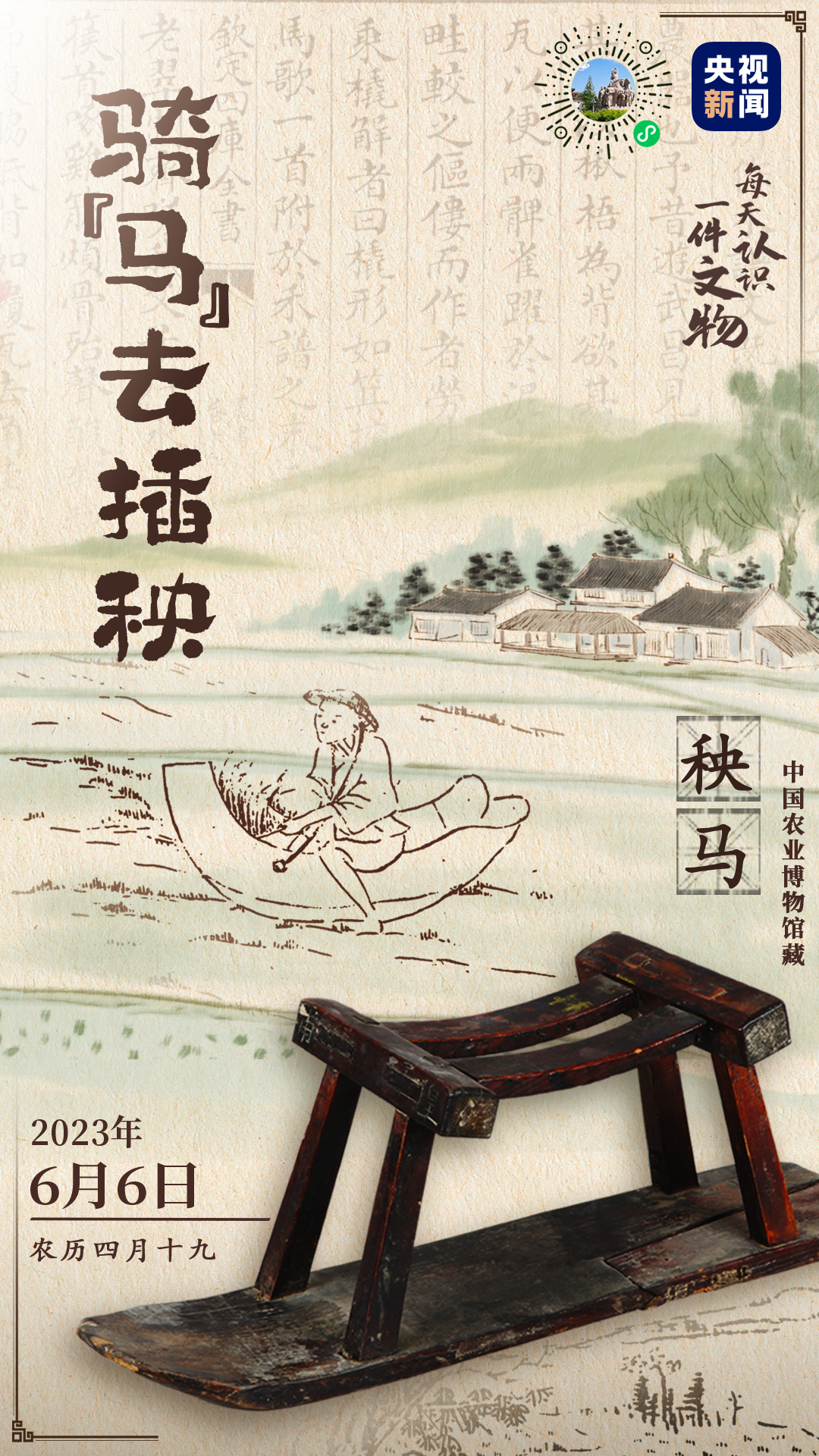 央视新闻联合全国博物馆推出文博科普产品《文博日历》,每天带您认识一件文物。腹部⽤枣⽊或榆⽊制成,易滑⾏,背部⽤楸⽊或桐⽊以减轻重量,形似⼩船,头尾翘起,中间洼凹,它就是农⺠拔秧插秧的好帮⼿——秧⻢。秧⻢最早出现在苏轼的诗“农夫皆骑秧⻢”,苏轼后来专⻔作了《秧⻢歌》,详细介绍了秧⻢的形制和使⽤⽅法,并在惠州地区宣传和推⼴~