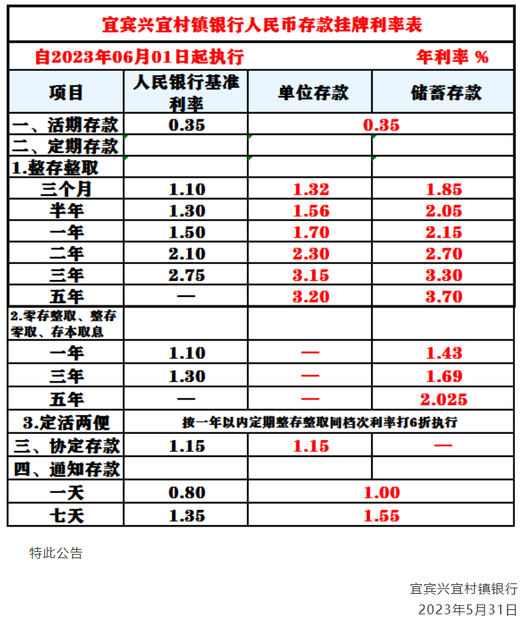 6月1日起,宜宾兴宜村镇银行整存整取一年期、二年期、三年期、五年期利率调整为2.15%、2.7%、3.3%、3.7%,分别较此前下调10BP、15BP、20BP、30BP。