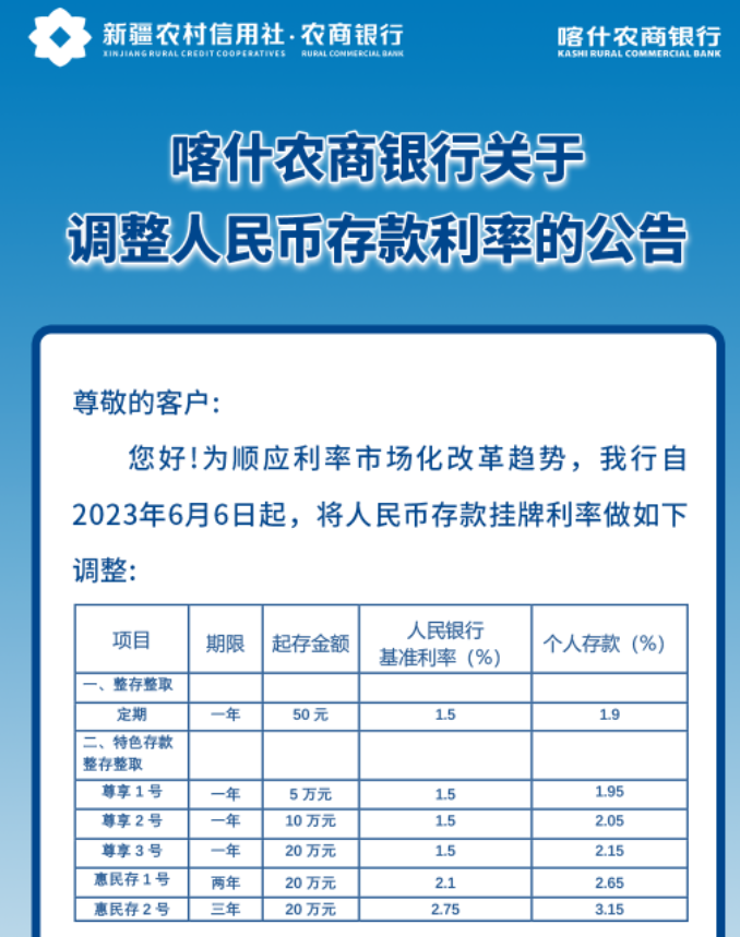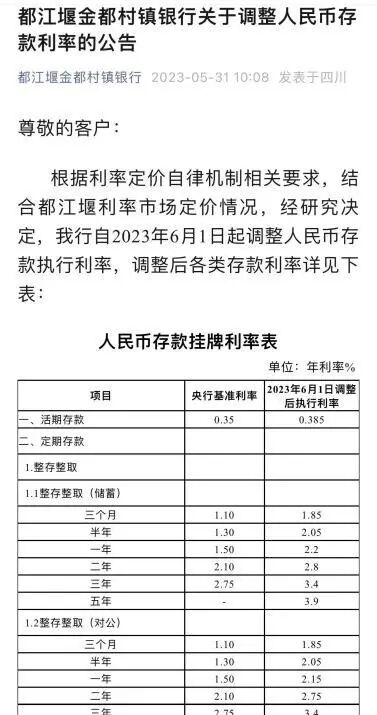 都江堰金都村镇银行公告显示,根据利率定价自律机制相关要求,结合都江堰利率市场定价情况,经研究决定,自6月1日起调整人民币存款执行利率。