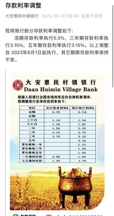 大安惠民村镇银行公告显示,自6月1日起调整部分存款利率。调整后的活期存款执行利率为0.3%,三年期和五年期的存款执行利率均为3.15%。其它期限存款利率保持不变。记者致电该行某支行,其工作人员告诉记者,调整前的活期存款利率为0.35%,三年、五年期存款利率均为3.3%。