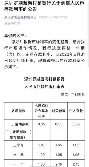 “5月15日,我们就下调了通知存款和协定存款利率。这次略微下调了定期存款利率。”深圳罗湖蓝海村镇银行某支行工作人员告诉记者,调整后的存款利率对新存入的存款生效,调整日前已存入的定期存款仍按开户日挂牌利率执行。