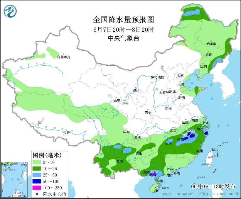 中央气象台预计,7日20时至8日20时,内蒙古东北部、黑龙江西北部、吉林东部、江南大部、西南地区南部、华南南部等地部分地区有中到大雨,其中,江西北部、浙江中部、广西东南部沿海等地部分地区有暴雨或大暴雨。