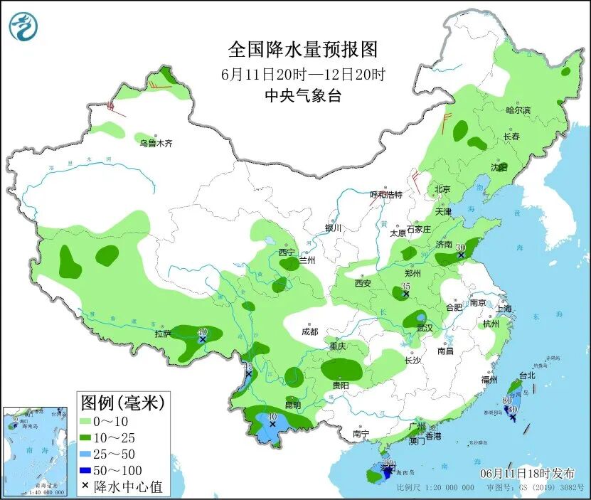 中央气象台预计,11日20时至12日20时,海南、广东南部沿海、台湾岛等地部分地区有大雨,局地暴雨,河南西部和南部、山东南部、湖北东部、西藏东南部、云南西部和南部等地局部地区有大雨。