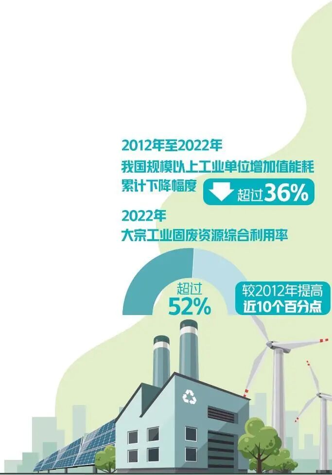 近年来,我国工业绿色发展取得明显成效。数据显示,2012年至2022年我国规模以上工业单位增加值能耗累计下降幅度超过36%;2022年大宗工业固废资源综合利用率超过52%,较2012年提高近10个百分点。