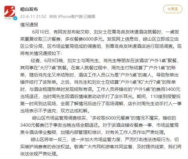 6月10日,有网友发布帖文称,刘女士在青岛良友味道酒店就餐时,一桌饭菜重复收取三次餐费,多收餐费6000多元。发现网上信息后,崂山区立即成立由区公安分局、区市场监管局组成的调查组,到青岛良友味道酒店进行现场调查。现将有关情况通报如下: