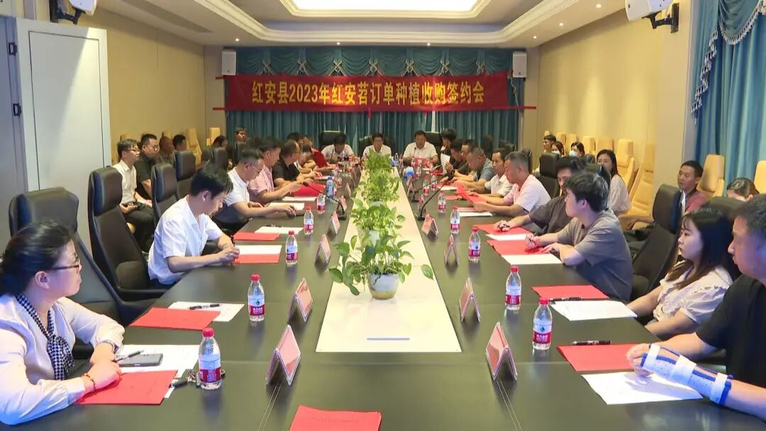 6月10日上午,红安县召开2023年红安苕订单种植收购签约会,现场20家来自全国各地的红苕收购企业与20家本地红苕种植企业签订“一对一”订单种植收购协议,总签约量达26.2万吨,总金额11.2亿元。