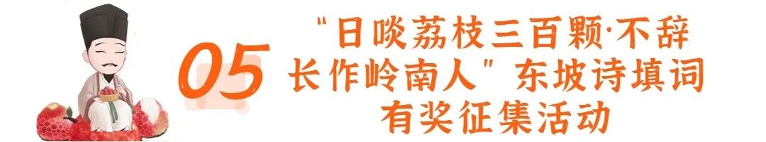 ☛活动内容:东坡寓惠写下名诗《惠州一绝/食荔枝》,其中“日啖荔枝三百颗”写出了东坡因荔枝爱上岭南,从此“不辞长作岭南人”。有奖征集活动目前已通过省、市媒体平台发出两项话题征集活动:以“因什么爱上岭南”为话题,征集粉丝在推文下方填写“不辞长作岭南人”上联内容;以“狂炫荔枝三百颗会发生哪些趣事”为话题,征集填写“日啖荔枝三百颗”下联内容。点赞数最多的评论将获评“最具人气奖”并颁发荣誉证书;以动画、漫画等方式创新填词的,将有机会获评“创意填词奖”并奖励相应奖金。