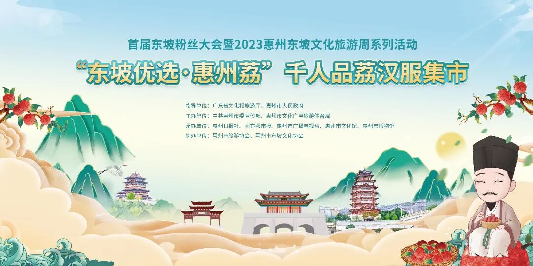 ☛活动内容:围绕“佳人相见一千年”主题,以东坡荔枝、东坡潮玩、东坡茶饮、文创雪糕为卖点,与惠州美食小吃相结合,举办“东坡优选·惠州荔”千人品荔汉服集市,通过设置网红打卡点、定点表演、汉服专业形象扮演互动等节目,吸引市民及游客参与。