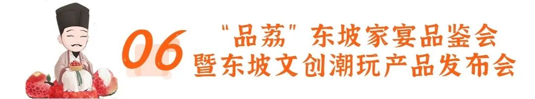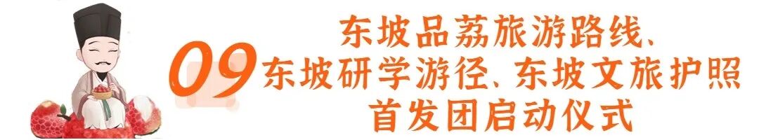 ☛活动内容:组织媒体记者、网红达人、旅行社行业代表等人员参与首发仪式,公开发布东坡品荔旅游路线、“幸惠西湖”东坡研学游径、推出《东坡文旅护照》以及文旅消费补贴旅游路线,结合荔枝成熟季开展“万人品尝东坡荔枝”等活动。