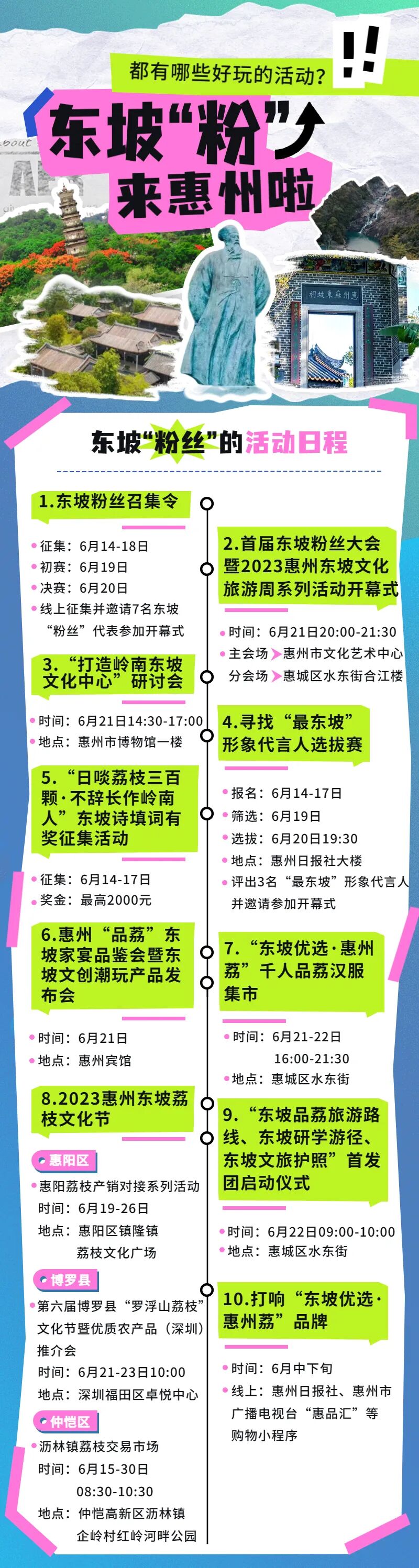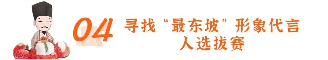 ☛活动内容:线上发出粉丝召集令,分别召集东坡的诗词粉、吃货粉、笔墨粉、打卡粉、才情粉、乐天粉、琼浆粉等7类粉丝,以图文并茂的方式说出“粉”东坡的理由,并线上报名生成二维码参与召集。组委会将邀请7名粉丝代表前来惠州参加粉丝大会,品东坡荔枝、游东坡游线。
