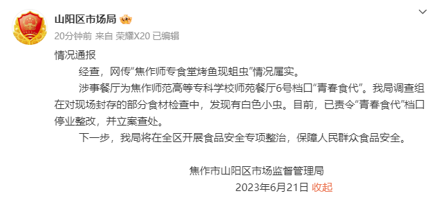 经查,网传“焦作师专食堂烤鱼现蛆虫”情况属实。
