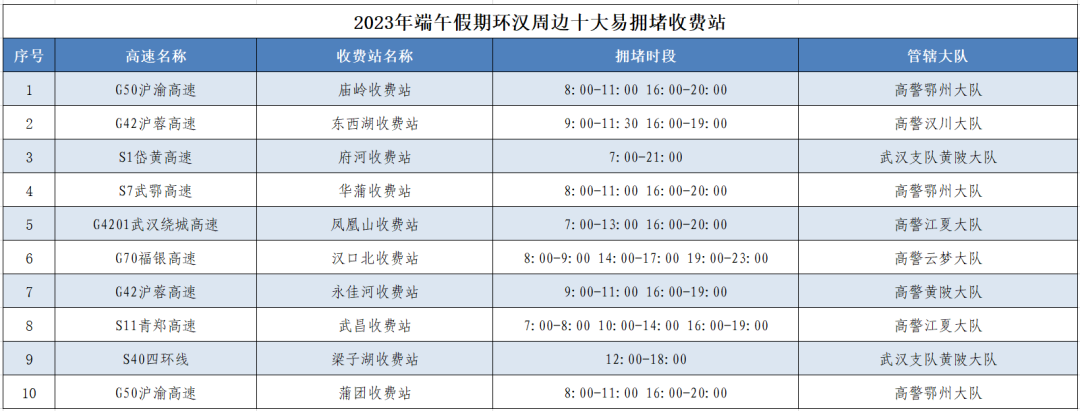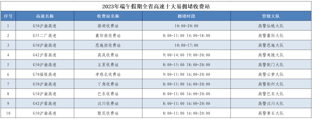 今年端午假期受夏收夏种夏管、暑期汛期假期叠加、高速公路不免费等多重因素影响,群众以中短途出行为主,预计全省车流量与去年同期及日常流量相比有所上升,但较春节、清明、“五一”相比略有所下降,同时根据旅游部门发布的《2023年端午假期旅游预测报告》显示,端午假期出行群体以青年和学生居多,主要交通方式是“高铁动车+本地公共交通”,活动范围主要集中在热门旅游城市的2小时通行圈内,武汉、宜昌、荆州、十堰、襄阳、恩施等热门旅游城市进出城通道、景区周边道路及重点收费站、服务区易出现“潮汐式”交通拥堵现象。