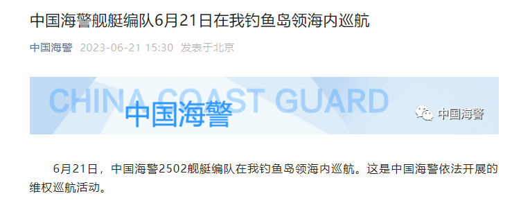 据中国海警微信公众号21日消息,6月21日,中国海警2502舰艇编队在我钓鱼岛领海内巡航。这是中国海警依法开展的维权巡航活动。