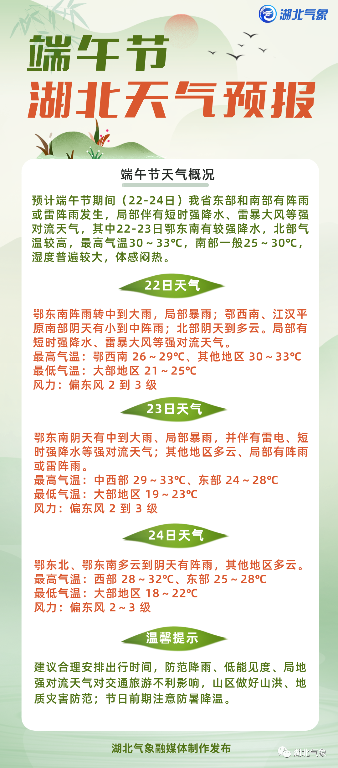 预计端午节期间(22-24日),湖北省东部和南部有阵雨或雷阵雨发生,局部伴有短时强降水、雷暴大风等强对流天气,其中22-23日鄂东南有较强降水,北部气温较高,最高气温30~33℃,南部一般25~30℃湿度普遍较大,体感闷热。