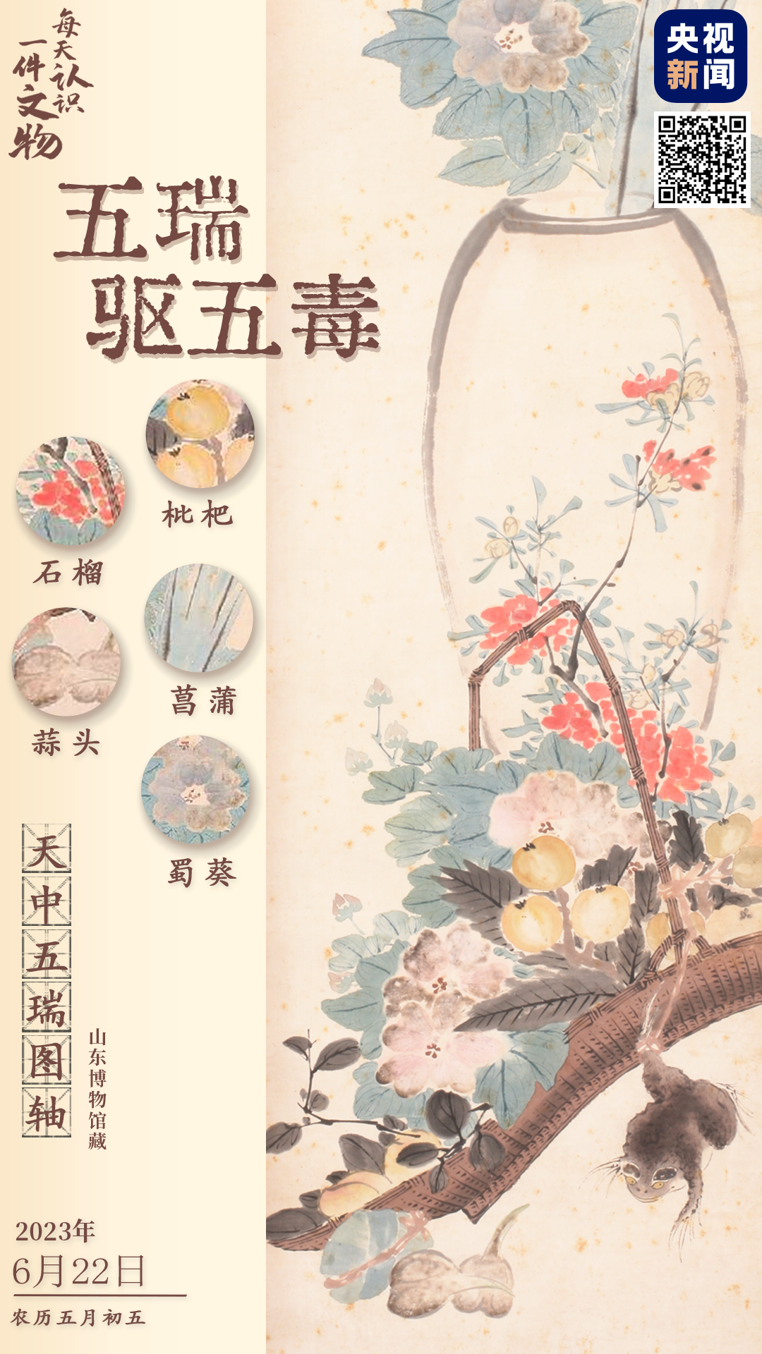 央视新闻联合全国博物馆推出文博科普产品《文博日历》,每天带您认识一件文物。《天中五瑞图》为清代画家蒋溥所绘,记录了古⼈的端午习俗“五瑞驱五毒”。画卷自上而下绘有“五瑞”:蜀葵、菖蒲、石榴、枇杷、蒜头。这些植物不仅是祥瑞之物,还能入药防病、招福驱邪。长按识别图中二维码,查看详情↓