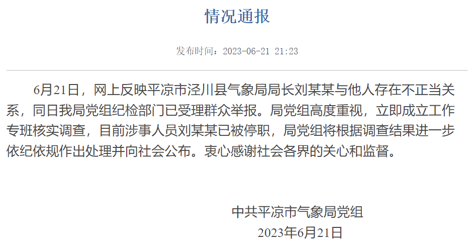 6月21日,网上反映平凉市泾川县气象局局长刘某某与他人存在不正当关系,同日我局党组纪检部门已受理群众举报。局党组高度重视,立即成立工作专班核实调查,目前涉事人员刘某某已被停职,局党组将根据调查结果进一步依纪依规作出处理并向社会公布。衷心感谢社会各界的关心和监督。