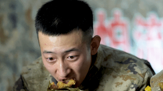 战士潘杰鑫刚吃了一口