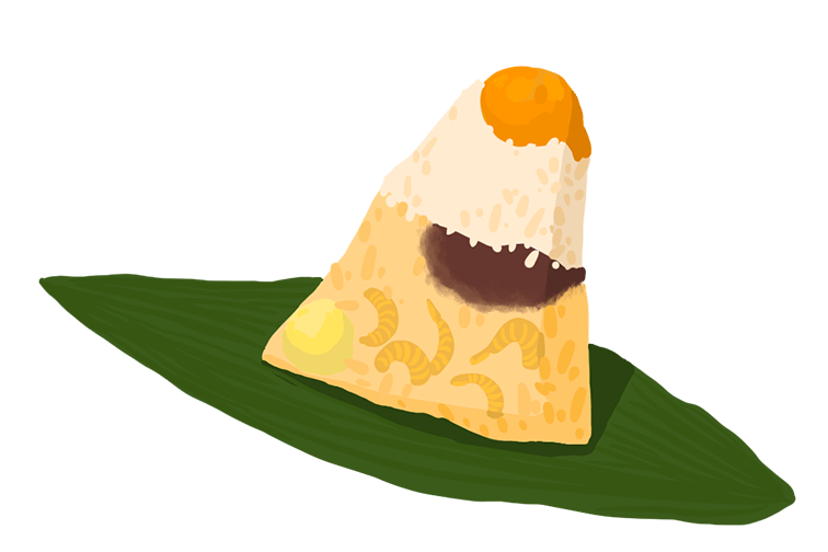 鸳鸯粽里的咸甜并不会串味,因为它每个“角”口味都不一样,一个角是蛋黄,一个角是豆沙,一个角是糯米,中间包虾、肉。