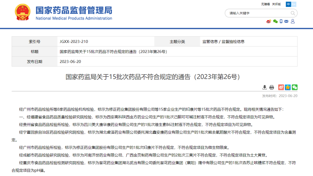 经广州市药品检验所等8家药品检验机构检验,标示为修正药业集团股份有限公司等15家企业生产的妇康片等15批次药品不符合规定。现将相关情况通告如下: