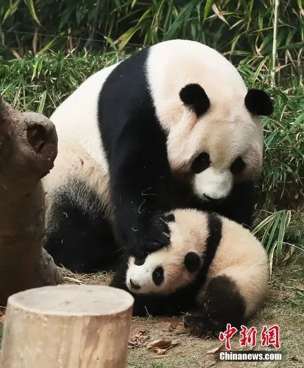 图为大熊猫母女爱宝和福宝在爱宝乐园亲密互动