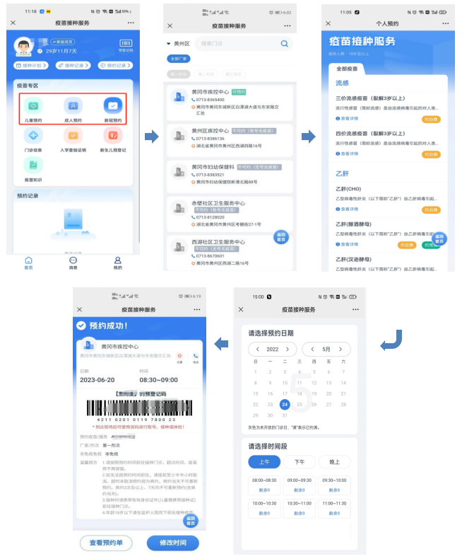 点击成人预约,选择需要预约的疫苗,阅读完该疫苗的知情同意书后,点击【我已阅读并知晓,去预约】,然后选择预约门诊黄冈市疾控中心,点击可预约,选择预约日期,选择时间段,立即预约。预约完成后,系统会反馈一个预约成功的信息,在预约的时间内,受种者须带身份证前往接种门诊接种。