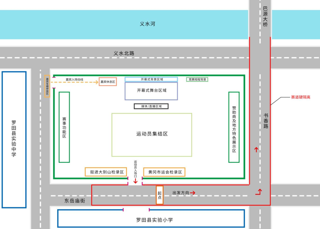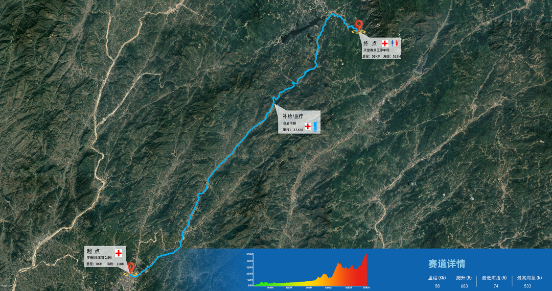 起点:罗田县体育公园(原东门田径场)→巴源大桥→大别山百里生态画廊牌楼→大河岸镇→白庙河镇(补给点)→九资河镇→终点:天堂寨风景区门楼广场。