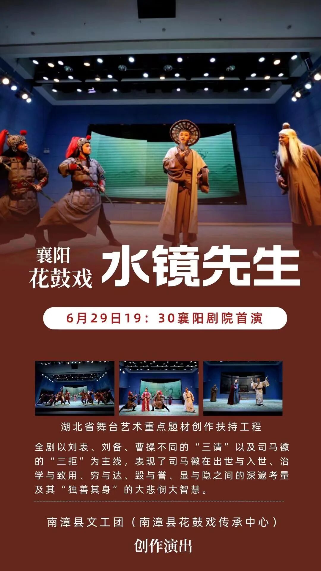 2023年,由市文化和旅游局主办的2023年“文化襄阳·好戏大家看”优秀剧(节)目展演之襄阳花鼓戏《水镜先生》,将于6月29日(今晚)19:30在襄阳剧院进行首演。