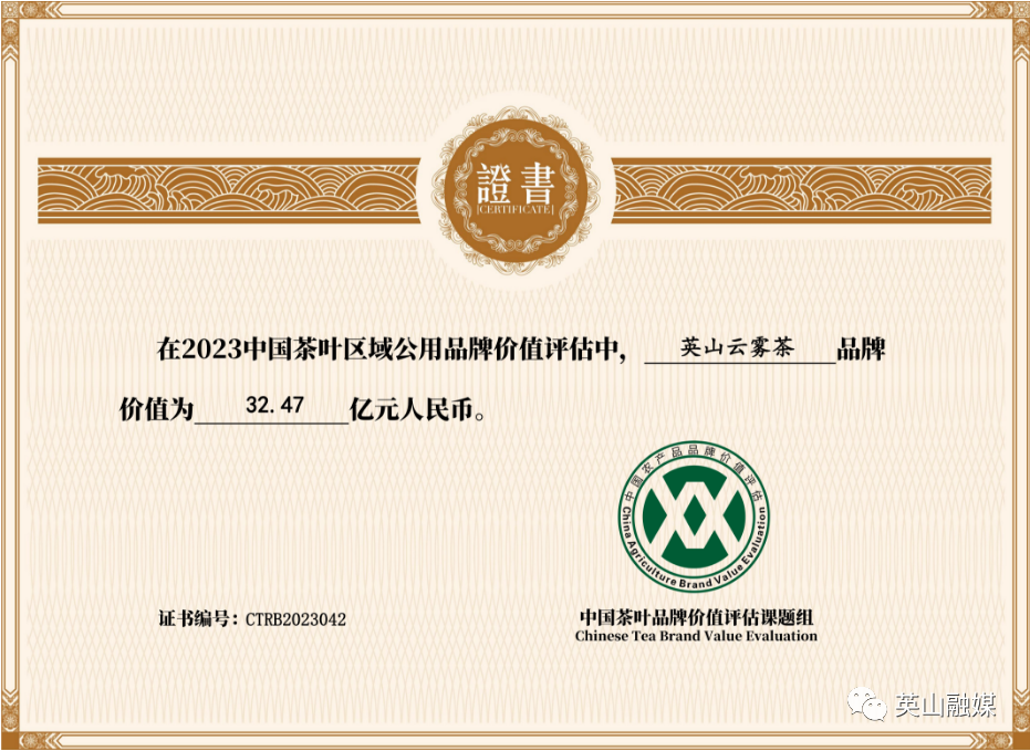 由中国国际茶文化研究会茶叶品牌建设专业委员会等机构联合开展的“2023中国茶叶区域公用品牌价值评估”课题结果发布,“英山云雾茶”区域品牌价值达32.47亿元,位居全国茶叶区域公用品牌第42位。