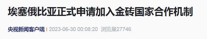 据央视新闻客户端30日消息,当地时间6月29日,埃塞俄比亚外交部发言人梅莱斯·阿莱姆表示,该国已正式申请加入金砖国家合作机制。