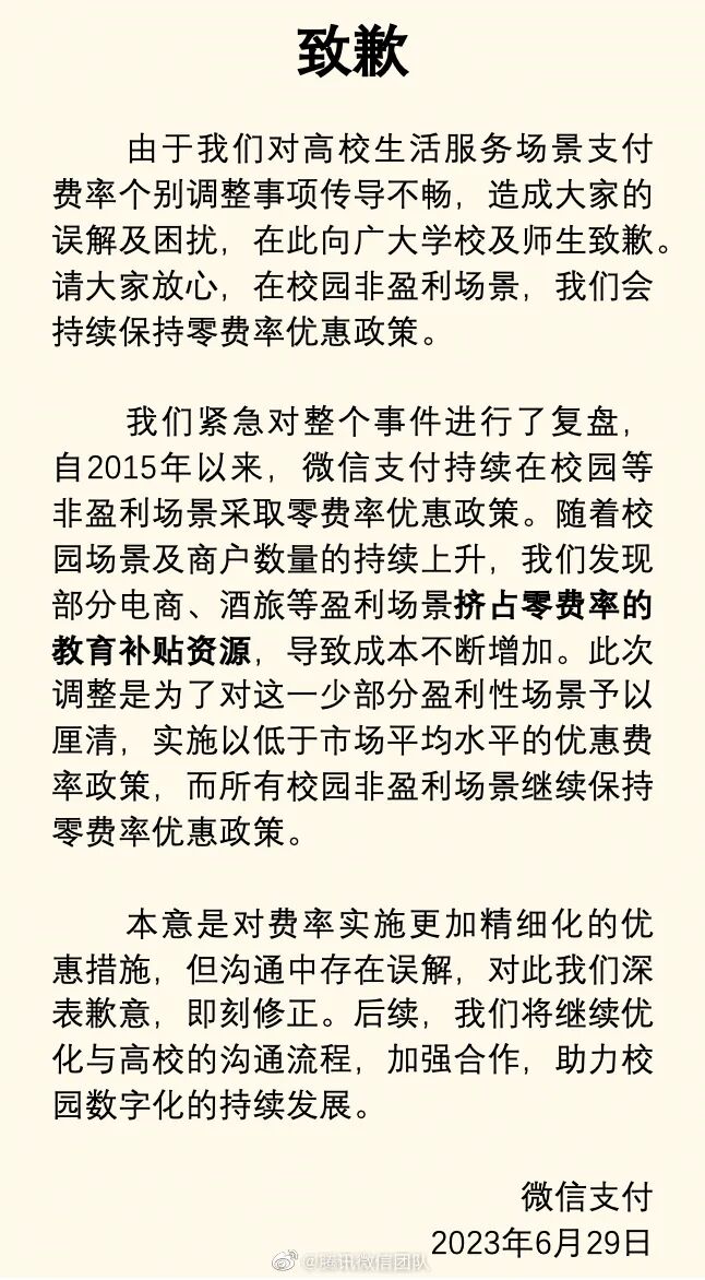 29日,@腾讯微信团队 发布声明,表示由于对高校生活服务场景支付费率问题处理不周,造成大家的困扰,在此向广大学校及师生致歉。