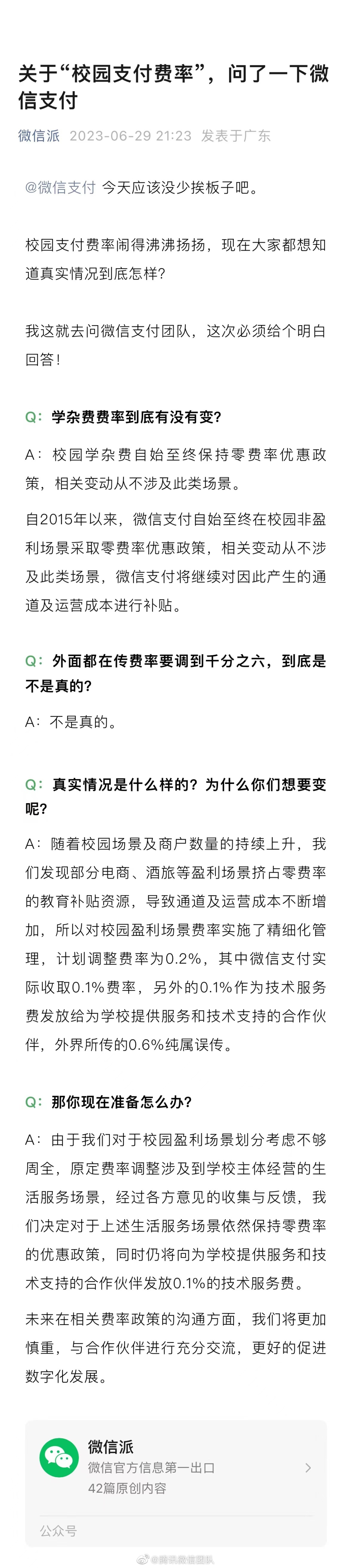 29日晚,“微信派”又发布问答形式的说明,表示微信支付对校园学杂费自始至终保持零费率优惠政策,而对校园盈利场景费率实施精细化管理,计划调整费率为0.2%,其中微信支付实际收取0.1%费率,另外的0.1%作为技术服务费发放给为学校提供服务和技术支持的合作伙伴,外界所传的0.6%纯属误传。