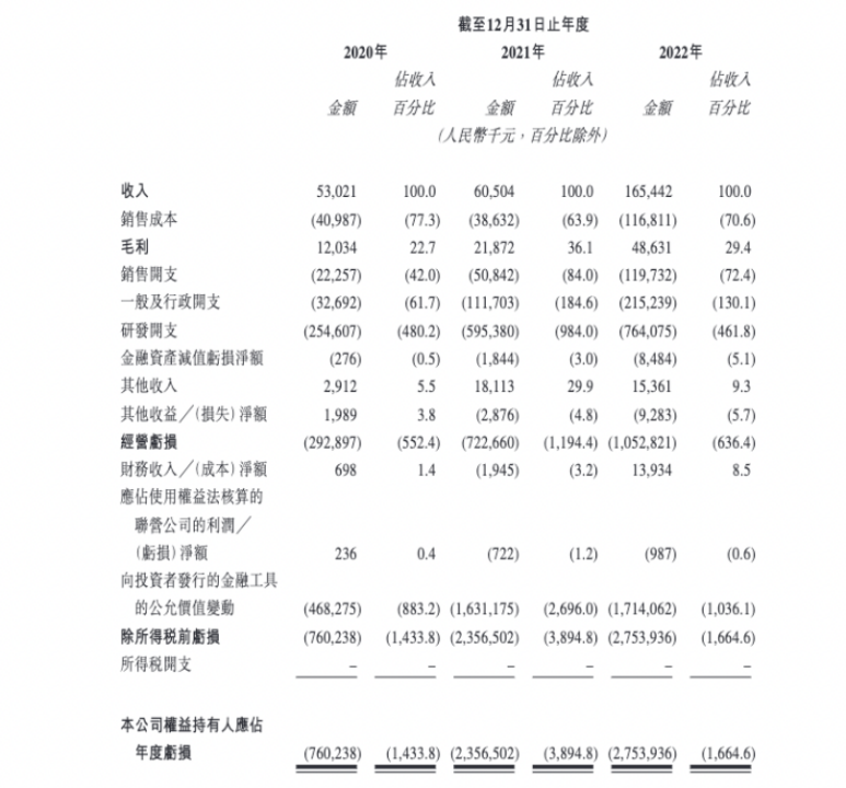 然而车规级芯片终究是一门烧钱的生意。招股书显示,2020年-2022年,黑芝麻智能收入分别为5302万元、6050万元以及1.65亿元,累计收入2.79亿元。而对应的经营亏损为2.93亿元、7.23亿元以及10.53亿元,经调整净亏损为2.73亿元、6.14亿元以及7亿元,三年合计亏损15.87亿。