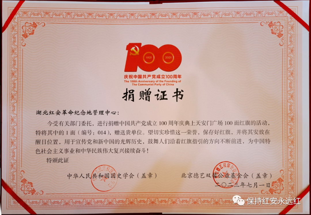 湖北红安革命纪念地管理中心(董必武故居纪念园管理处)获赠天安门广场百年庆典红旗——第014号红旗。