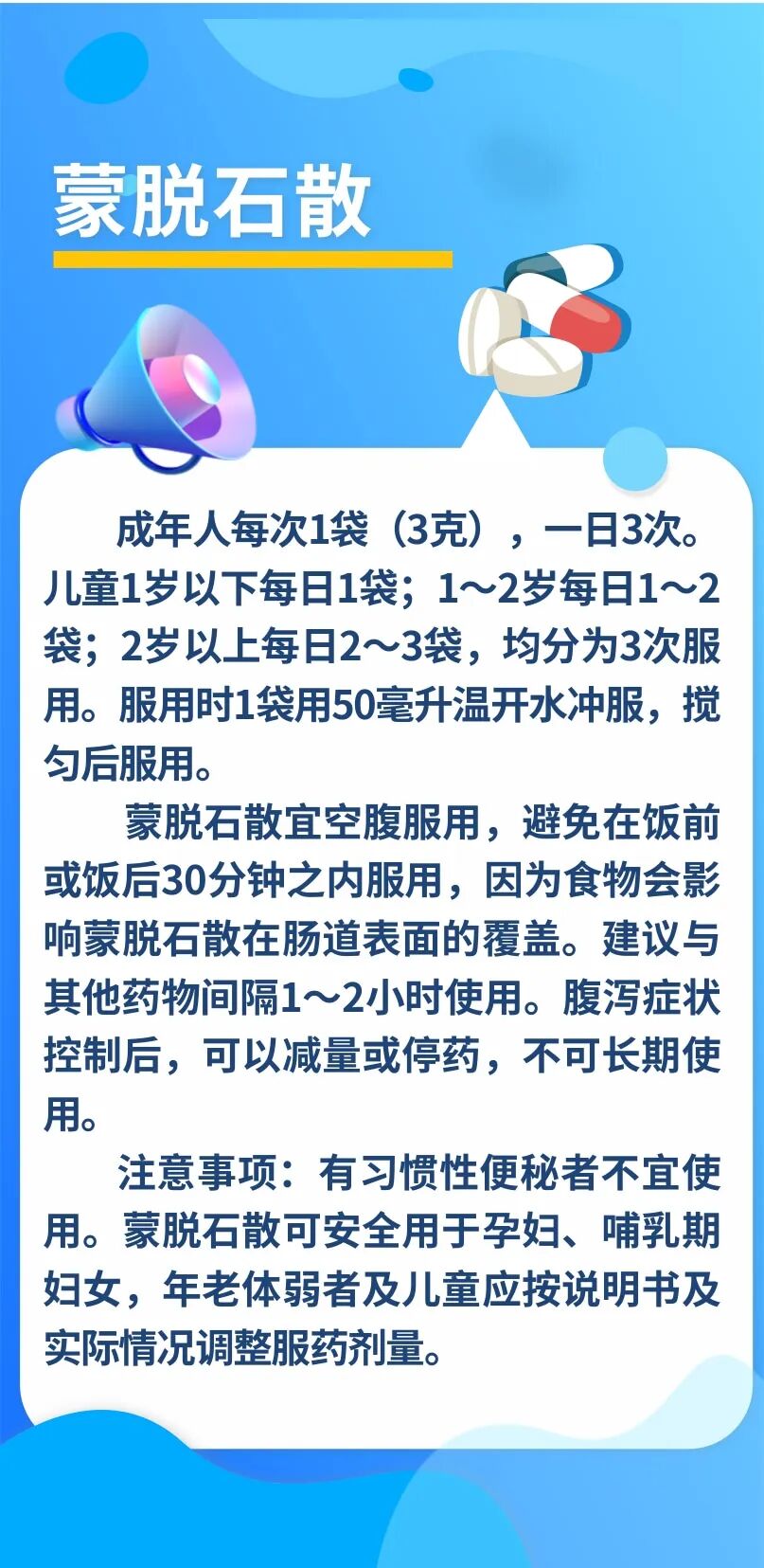 止泻药物中常用的是蒙脱石散,它是一种高效的消化道黏膜保护剂,主要结构为双八面体蒙脱石,对消化道内的病毒、细菌及其产生的毒素有较强的固定抑制作用,同时具有提高黏膜质量,有效阻止病原微生物攻击的作用。蒙脱石散作用于消化道而不被吸收,无毒副作用。