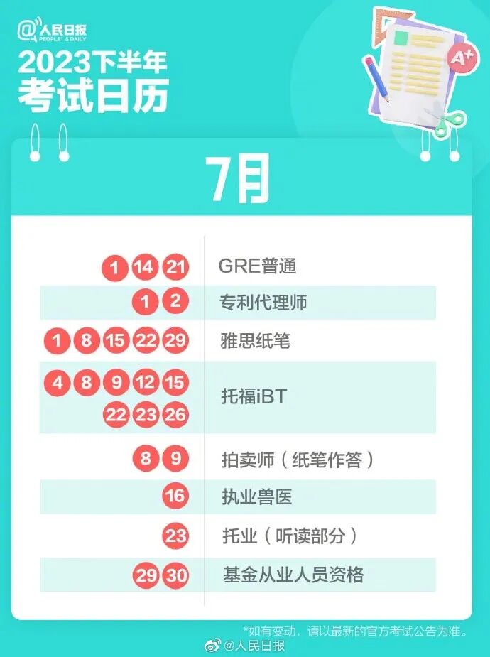 2023已过半你的学习目标达成了吗? 下半年可以参加哪些考试? 收好这份2023年下半年考试日历做好日程规划提前准备,不留遗憾! (如有变动请以最新的官方考试公告为准) ↓↓↓ 来源:湖北发布、人民日报微博