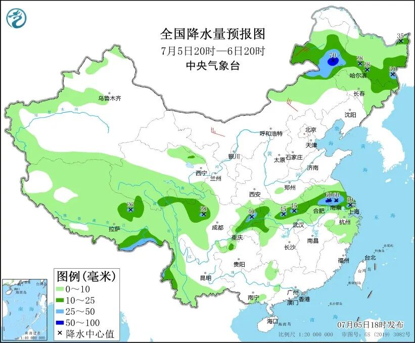 中央气象台预计,5日20时至6日20时,内蒙古东部、黑龙江南部和东部、江苏中南部、上海、安徽中部、湖北大部、四川东北部、重庆大部、川西高原北部、青海南部、西藏北部和东南部、云南西部等地部分地区有中到大雨,局地暴雨。