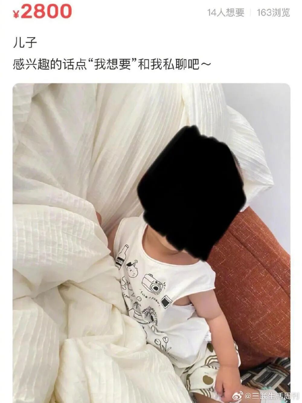 据该相关截图显示,一名IP属地为安徽的卖家,在闲鱼平台上架了名为“儿子”的产品,售价为2800元。