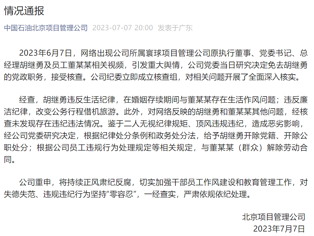 中国石油北京项目管理公司7月7日发布通报,全文如下: