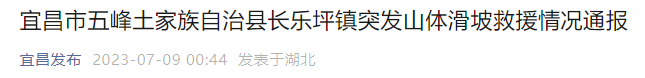 7月9日凌晨,“宜昌发布”发布“宜昌市五峰土家族自治县长乐坪镇突发山体滑坡救援情况通报”,全文如下: