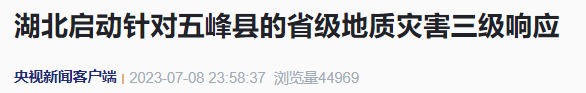 根据《湖北省突发地质灾害应急预案》及有关规定,湖北省应急管理厅决定自2023年7月8日23时起,启动针对五峰县的省级地质灾害三级响应。