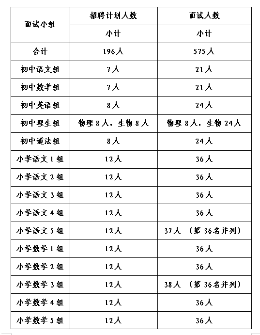 按报考学段学科分组,共设19个面试小组,同时进行面试,面试时间为一天。具体分组如下: