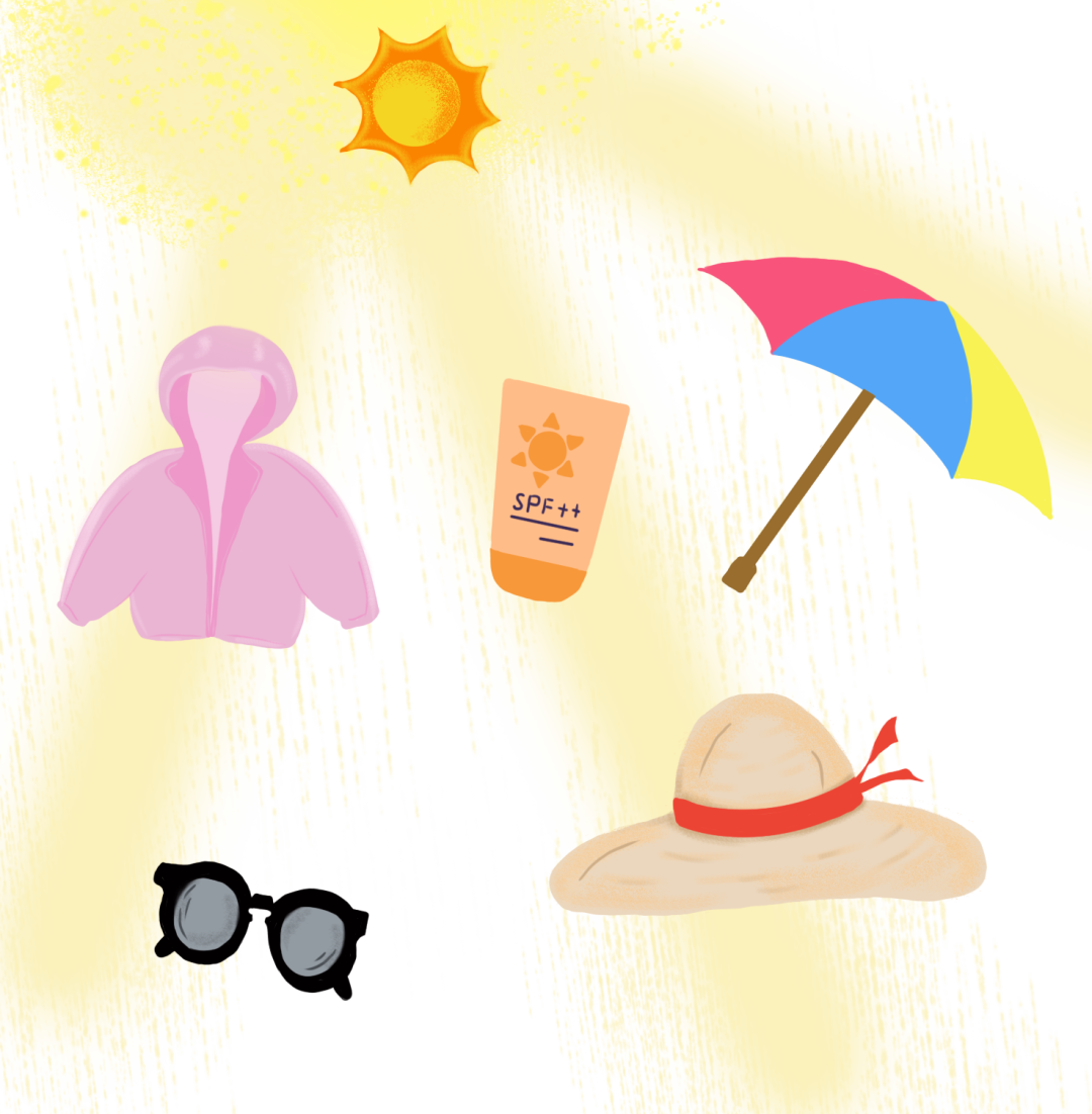 外出要做好防晒的工作,替孩子戴好帽子、擦汗小手巾,打好遮阳伞。