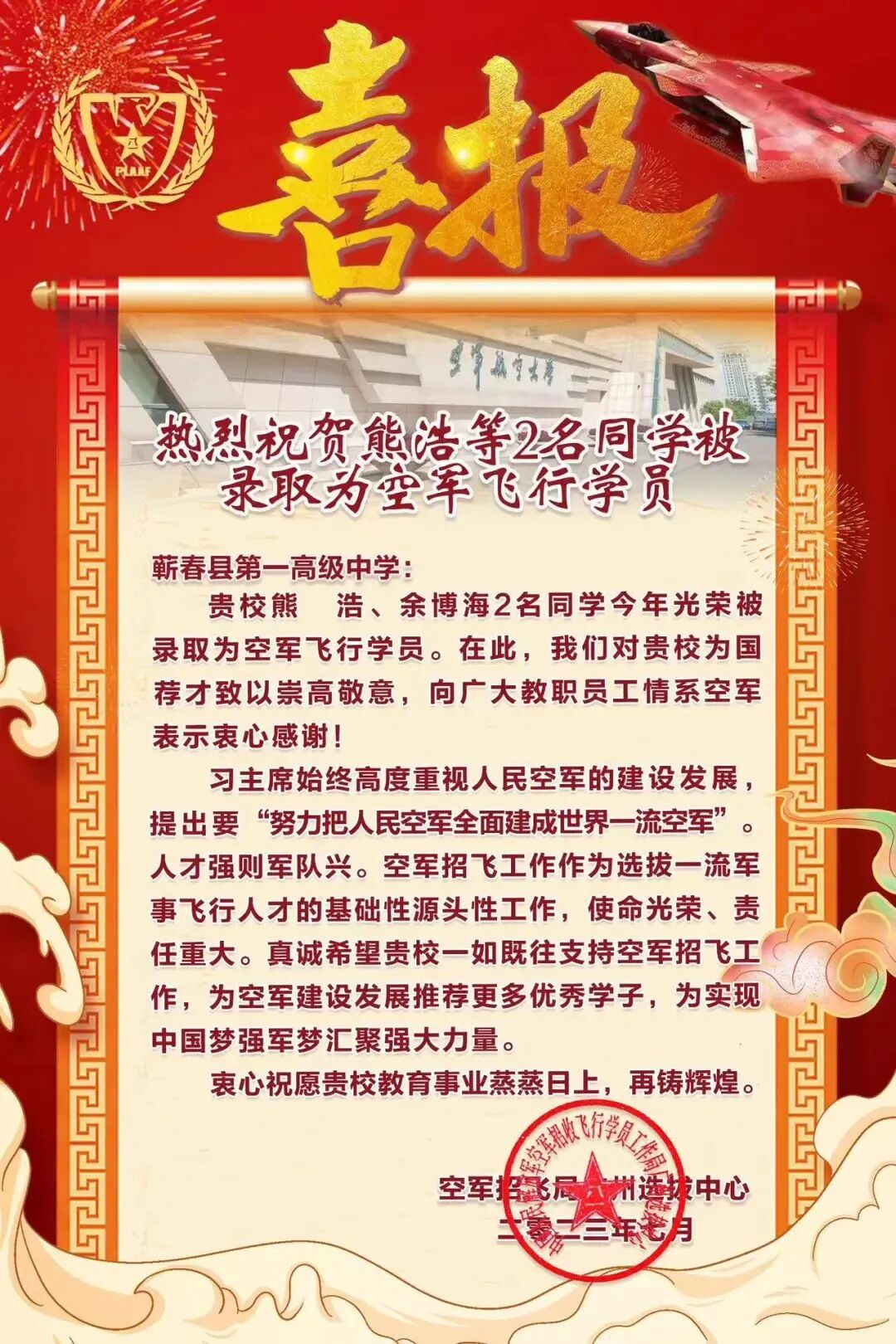 蕲春县2023届毕业生熊浩、余博海光荣被录取为空军飞行学员,即将用奋斗书写自己的“梦想天空”,保卫祖国的蓝天和疆土。