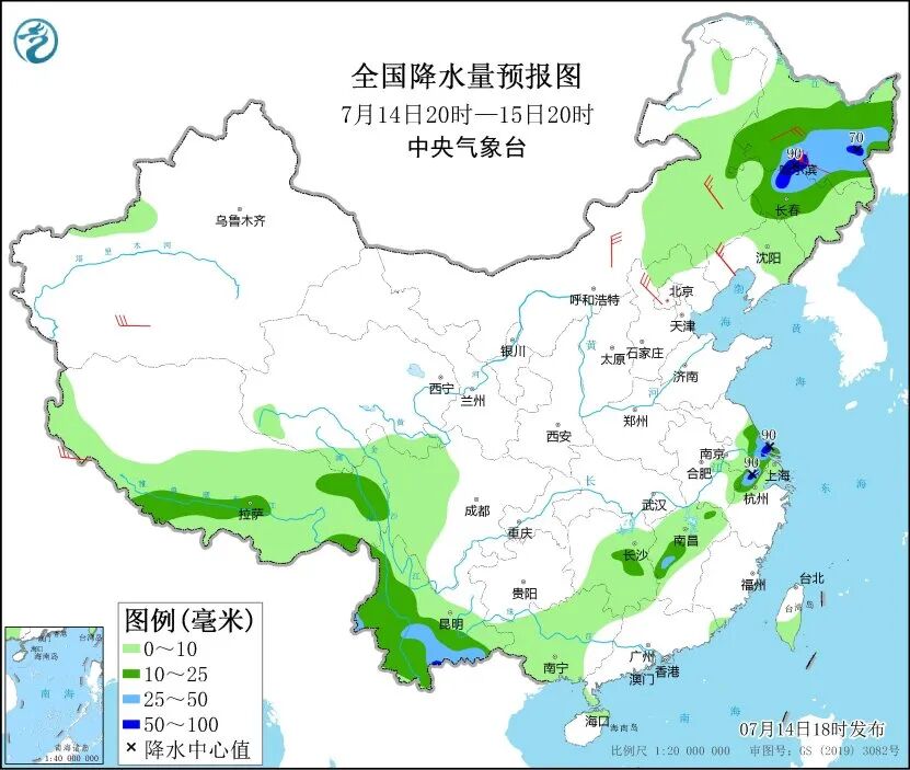 中央气象台14日18时继续发布暴雨蓝色预警,预计14日20时至15日20时,黑龙江中南部、吉林中西部、江苏南部、浙江西北部、云南南部和西部等地部分地区有大雨,其中,黑龙江南部、吉林西部等地局地有暴雨。