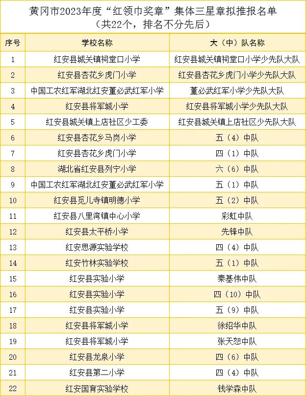 为深入贯彻落实《中共中央关于全面加强新时代少先队工作的意见》精神,贯彻落实共青团中央、教育部、全国少工委《关于构建阶梯式成长激励体系增强少先队员光荣感的指导意见》的精神,切实增强少先队员的光荣感、使命感,按照共青团黄冈市委、黄冈市教育局、黄冈市少工委《关于开展2023年黄冈市“红领巾奖章”三星章争章活动的通知》文件要求,红安县少工委拟推报吴梦妍等112名少先队员为黄冈市“红领巾奖章”三星章个人候选人,红安县城关镇祠堂口小学少先队大队等22个少先队大、中队为黄冈市“红领巾奖章”三星章集体候选集体(名单附后)。现面向全县公示,公示期为7月21日至7月27日,公示期间,如有异议,可通过电话实名举报,举报查实的,将终止其资格。