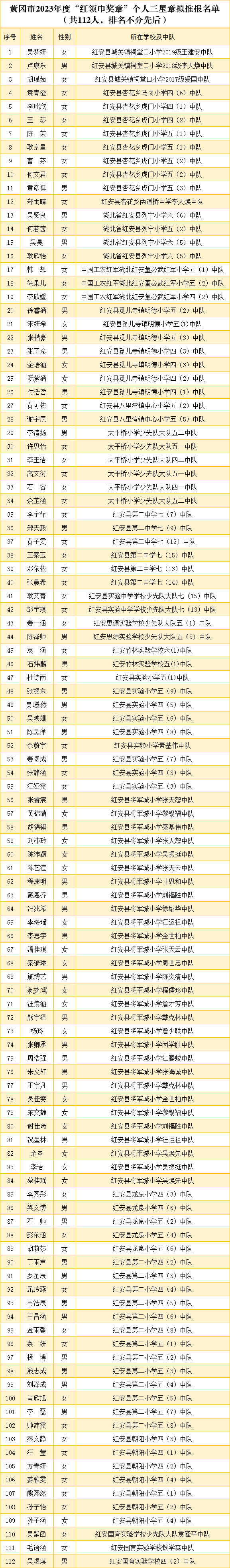 112名少先队员为黄冈市“红领巾奖章”三星章个人候选人