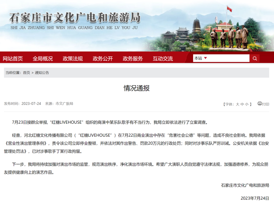 据石家庄市文化广电和旅游局7月24日消息,7月23日接群众举报,“红糖LIVEHOUSE”组织的商演中某乐队歌手有不当行为,该局立即依法进行了立案调查。