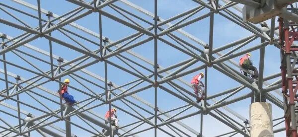 7月25日,在十堰武当山机场国际航站楼项目施工现场,工人们正在进行屋顶钢结构网架拼装和焊接,水电安装预埋管线等工作也在同步进行,项目主体结构已基本成形,正在进行大型钢网架顶升作业。