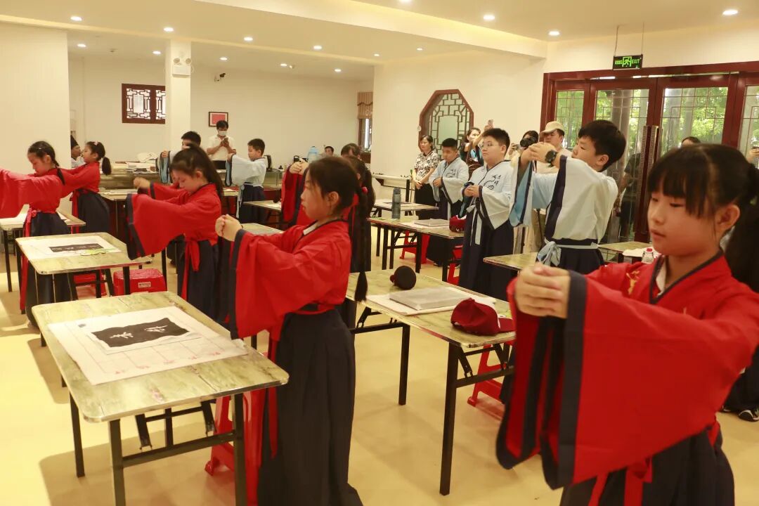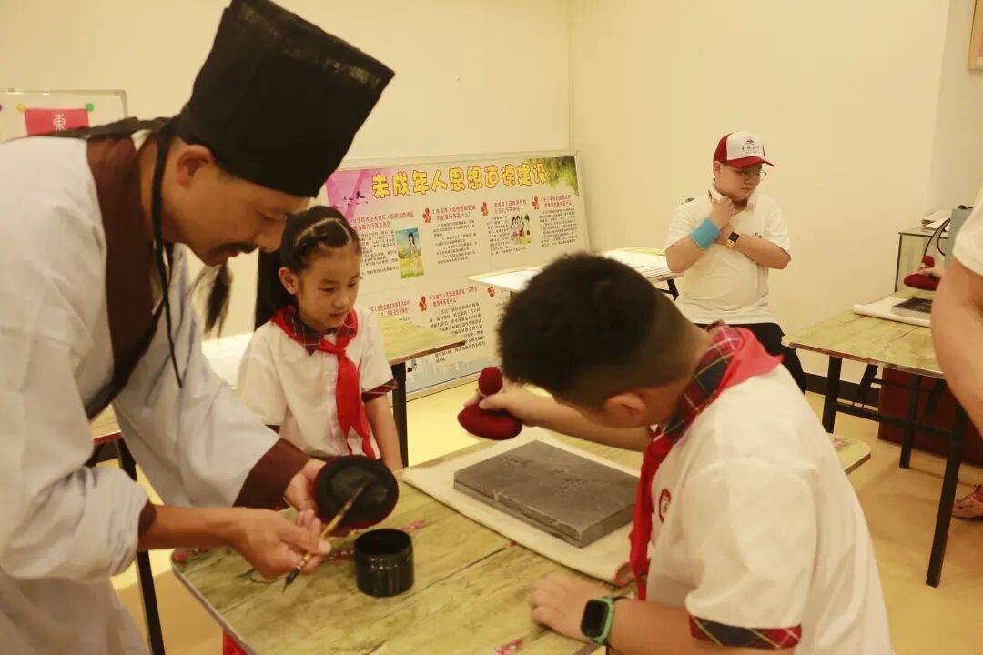 研学团队首先来到了东坡赤壁的苏学馆,在这里学习了汉服礼仪、拓片制作等实践课程,通过沉浸式体验,亲身感受东坡文化的独特魅力。学生踊跃提问,与专家老师积极互动,引来了现场参观游览东坡赤壁的游客热情围观。