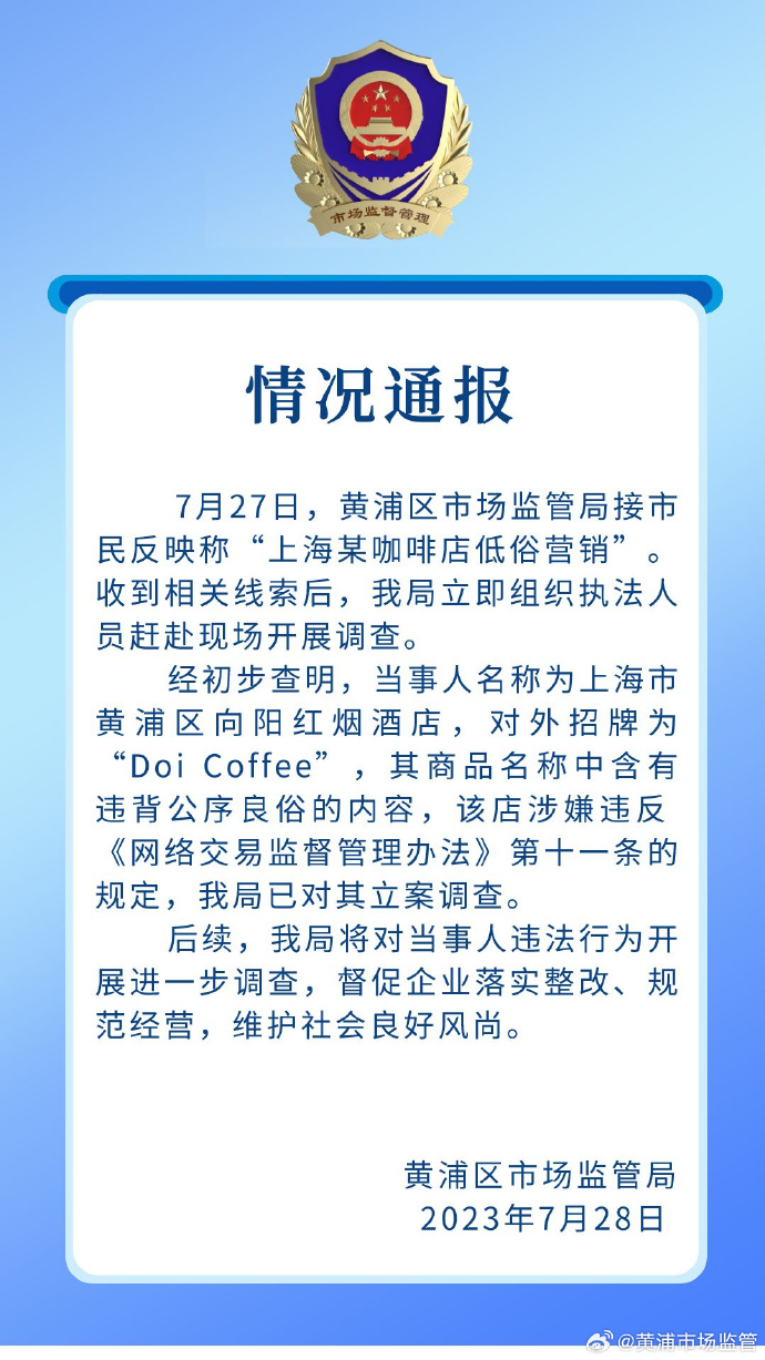 经初步查明,当事人名称为上海市黄浦区向阳红烟酒店,对外招牌为“Doi Coffee”,其商品名称中含有违背公序良俗的内容,该店涉嫌违反《网络交易监督管理办法》第十一条的规定,我局已对其立案调查。